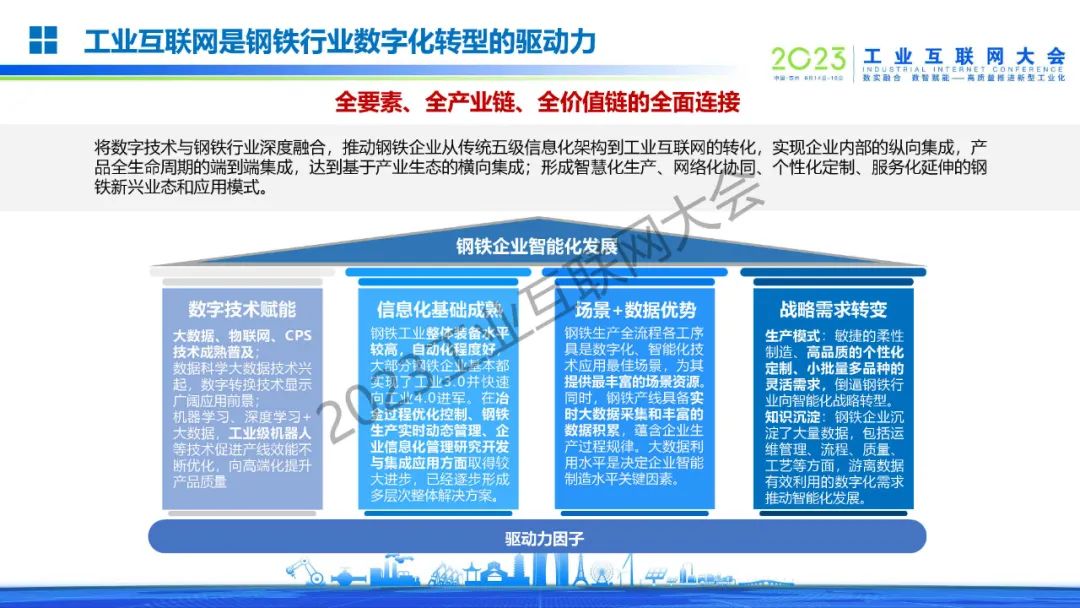 姜濤介紹,鋼鐵工業(yè)迎來高端化、智能化、綠色化發(fā)展新時(shí)代,是國民經(jīng)濟(jì)的重要基礎(chǔ)產(chǎn)業(yè),是國之基石。工業(yè)互聯(lián)網(wǎng)是鋼鐵行業(yè)數(shù)字化轉(zhuǎn)型的驅(qū)動(dòng)力。將數(shù)字技術(shù)與鋼鐵行業(yè)深度融合,推動(dòng)鋼鐵企業(yè)從傳統(tǒng)五級(jí)信息化架構(gòu)到工業(yè)互聯(lián)網(wǎng)的轉(zhuǎn)化,實(shí)現(xiàn)企業(yè)內(nèi)部的縱向集成,產(chǎn)品全生命周期的端到端集成,達(dá)到基于產(chǎn)業(yè)生態(tài)的橫向集成;形成智慧化生產(chǎn)、網(wǎng)絡(luò)化協(xié)同、個(gè)性化定制、服務(wù)化延伸的鋼鐵新興業(yè)態(tài)和應(yīng)用模式。