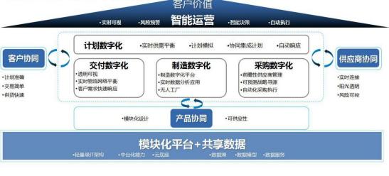 在數字化轉型的業務框架方面 ,我們主張對基礎系統要進行模塊化建設 ,再加上共 享數據 ,就是數字化轉型的基礎 ,核心部分是交付、制造、采購業務數字化 ,通過計劃 數字化的控制塔拉通 ,對內協同產品與研發對外協同客戶與合作伙伴 ,通過智能運營平 臺最終為客戶增加價值。