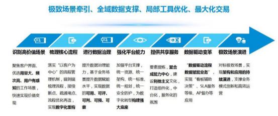 在如何開展數字化轉型方面 ,我們沉淀了數字化轉型的方法論 ,我們總結為四句話 , 極致場景牽引、全域數據支撐、局部工具優化、實現最大化交易。這套方法論在所有業