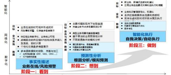第二階段 :業務可預測。對供應鏈各業務能實現未來風險預警。構建各關鍵業務環 節的典型業務場景數據模型,通過現有及外來的大數據分析來追溯現有問題根因以及預 測未來趨勢和風險應對,這一階段可先實現內部供應鏈協同與應用,并逐步擴大到關鍵客 戶與供應商的協同與應用。