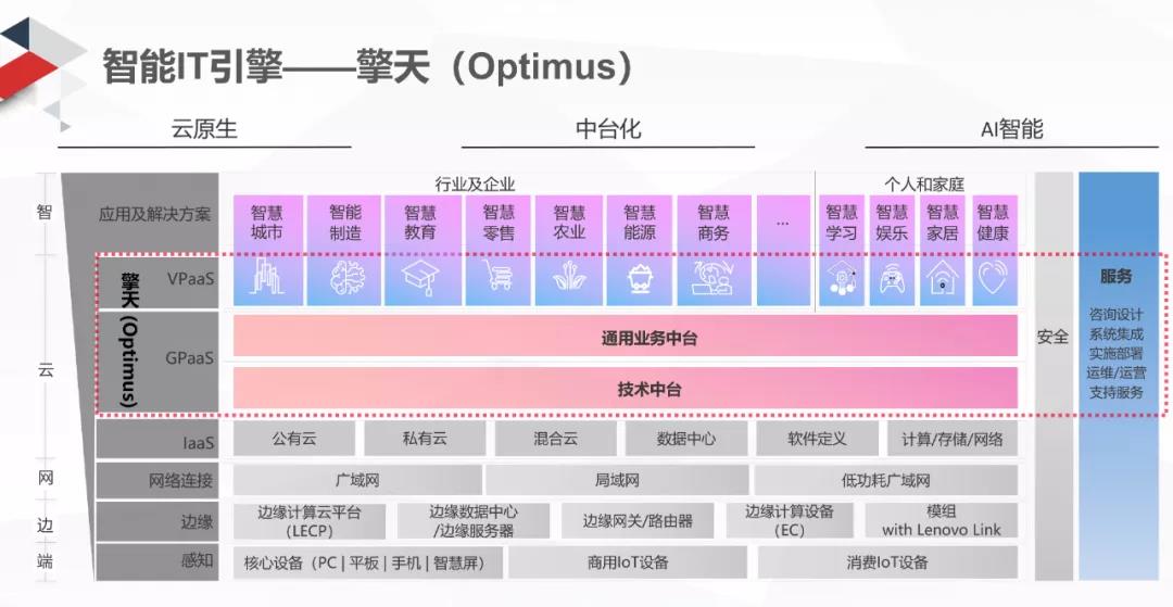 聯(lián)想智能IT引擎“擎天”是基于“端-邊-云-網(wǎng)-智”新IT架構(gòu)的內(nèi)核,包含了技術(shù)中臺和通用業(yè)務(wù)中臺的GPaaS層,以及面向不同行業(yè)領(lǐng)域的VPaaS層,具有云原生、中臺化、AI智能三大技術(shù)特征。