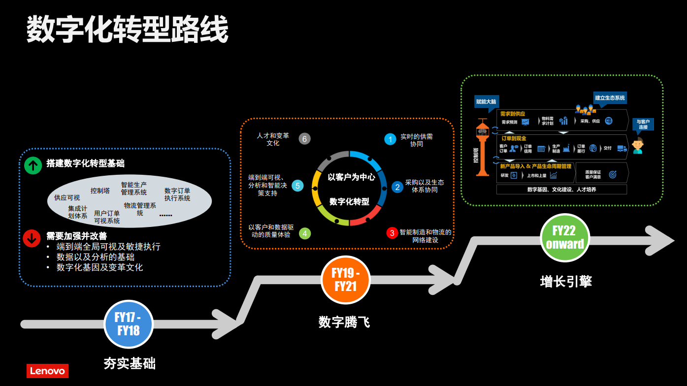 2017-2019年是聯(lián)想數(shù)字化轉(zhuǎn)型全面推廣的階段,在這段時間,聯(lián)想著重于向數(shù)字化原生組織轉(zhuǎn)型,以數(shù)字化技術(shù)引領(lǐng)數(shù)字化業(yè)務(wù)創(chuàng)新: