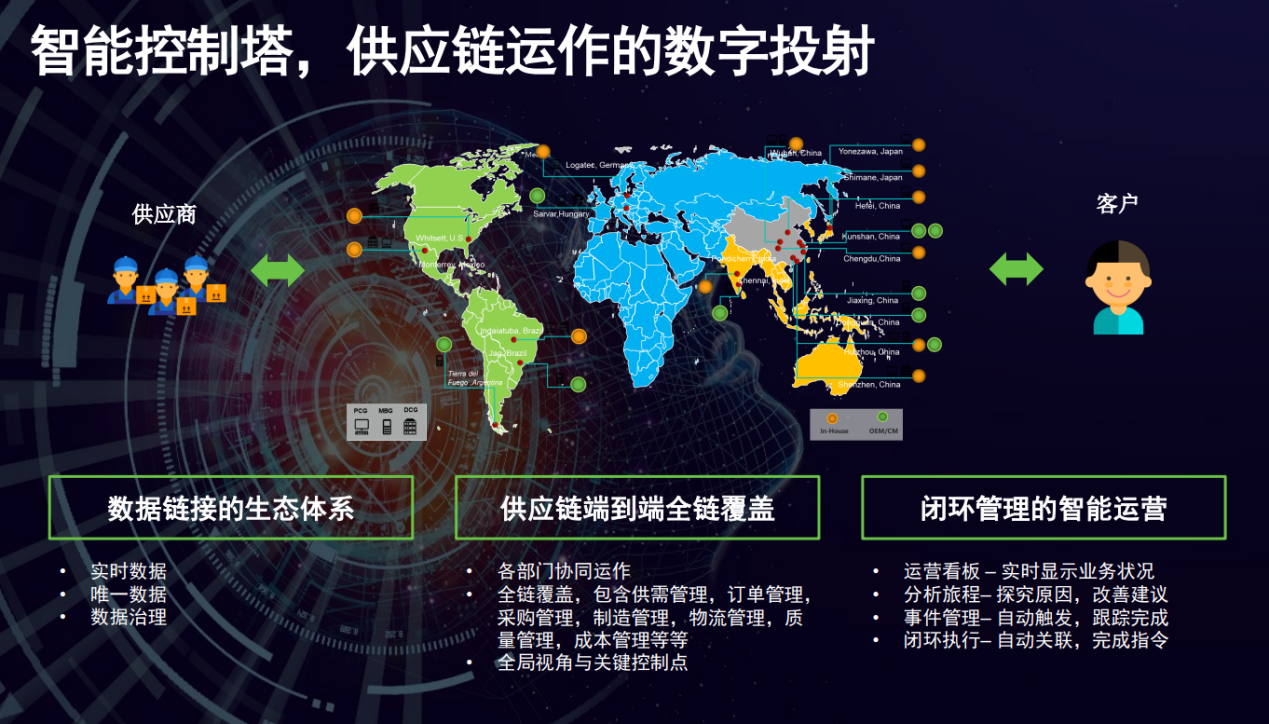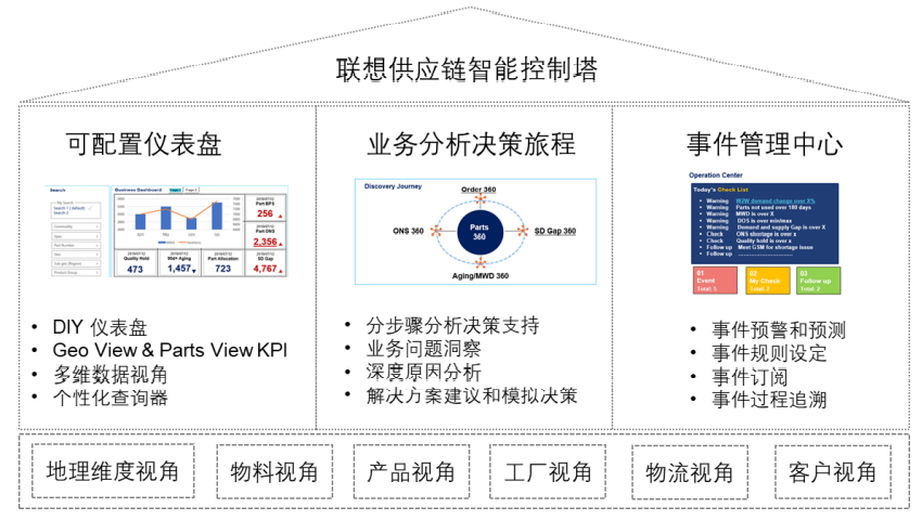 供應(yīng)鏈智能控制塔是供應(yīng)鏈運作的指揮中心。控制塔提供了全方位視角,打通 了端到端的數(shù)據(jù)鏈接,能更全面的從客戶、區(qū)域、運輸、物料、產(chǎn)品,工廠等不同維度來審視 供應(yīng)鏈的業(yè)務(wù)問題和改進(jìn)點。功能特性包含了可配置儀表盤、業(yè)務(wù)分析決策旅程和業(yè)務(wù)事件管 理中心。