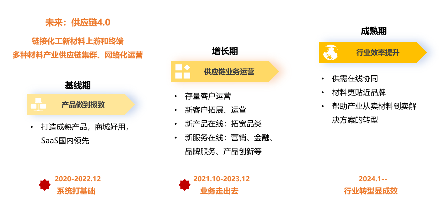 增長期一方面繼續在供應鏈S&OP方面深化對華峰產業公司的服務,包括提供銷售預測、庫存排單等管理支持;另一方面拓展產業下游的客戶和周邊替代品/互補品企業作為賣家上線交易,為下游客戶提供數字化工具,積累行業數據;擴大營銷、供應鏈金融等服務面,將增值服務推廣至華峰以外的客戶使用。