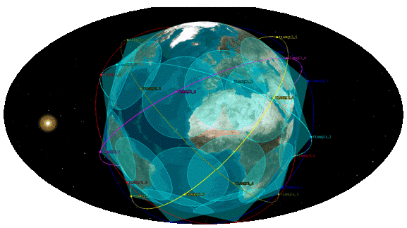 空間段:主要是由38顆DCS衛星,構成天啟衛星星座,以及DCS載荷系統組成,實現全球覆蓋;通過部署在六個軌道平面上的38顆衛星,由通信鏈路將多個軌道平面上的衛星聯結起來形成,形成星座組網;為地面用戶提供覆蓋全球的天基物聯網通信服務。