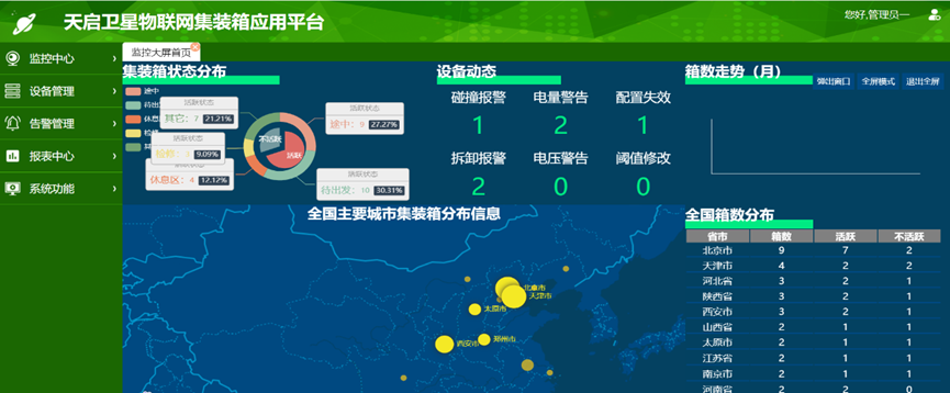 系統通過在中集集團所屬的集裝箱上部署基于天啟低軌衛星通信的衛星數據終端,采集集裝箱供應鏈相關的集裝箱流轉過程中的各種要素信息,包括環境溫濕度、箱內溫濕度、箱體位置、流轉軌跡、箱門開關狀態、液位、液壓等各類要素信息,針對集裝箱的運輸軌跡、箱體位置、運輸過程箱體狀態進行連續性長時間的監測管理,針對各類違規及異常進行預警、報警信息。