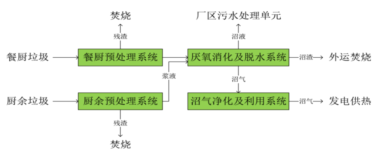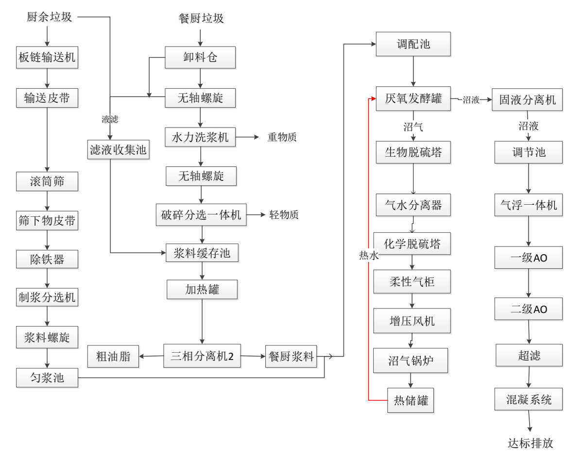 餐廚廢棄物和廚余廢棄物進(jìn)場地磅稱重后卸至接投料倉,進(jìn)入不同的預(yù)處理生產(chǎn)線。餐廚垃圾通過無軸螺旋輸送進(jìn)入水力洗漿機(jī)、破碎分選一體機(jī)分別去除重物質(zhì)和塑料輕物質(zhì),制漿后與廢棄油脂混合,經(jīng)過加熱后進(jìn)入三相分離機(jī),進(jìn)行全物料提油,三相分離之后的漿料與分選破碎制漿的廚余垃圾漿料混合泵入CSTR厭氧單元進(jìn)行厭氧消化,產(chǎn)生的沼氣經(jīng)生物脫硫系統(tǒng)凈化后進(jìn)入氣柜暫存,經(jīng)凈化增壓后發(fā)電和供鍋爐燃燒。產(chǎn)生的沼渣沼液進(jìn)入固液分離系統(tǒng)實(shí)現(xiàn)固液分離,分離出的沼渣送入焚燒廠,沼液進(jìn)入污水處理單元處理,處理達(dá)標(biāo)后進(jìn)入城鎮(zhèn)排水管網(wǎng)排放。