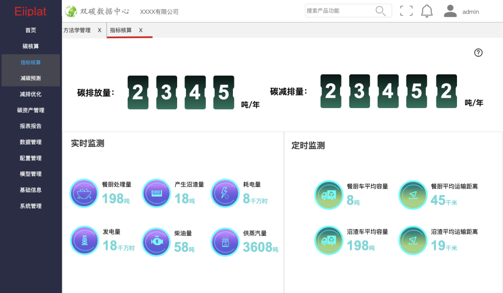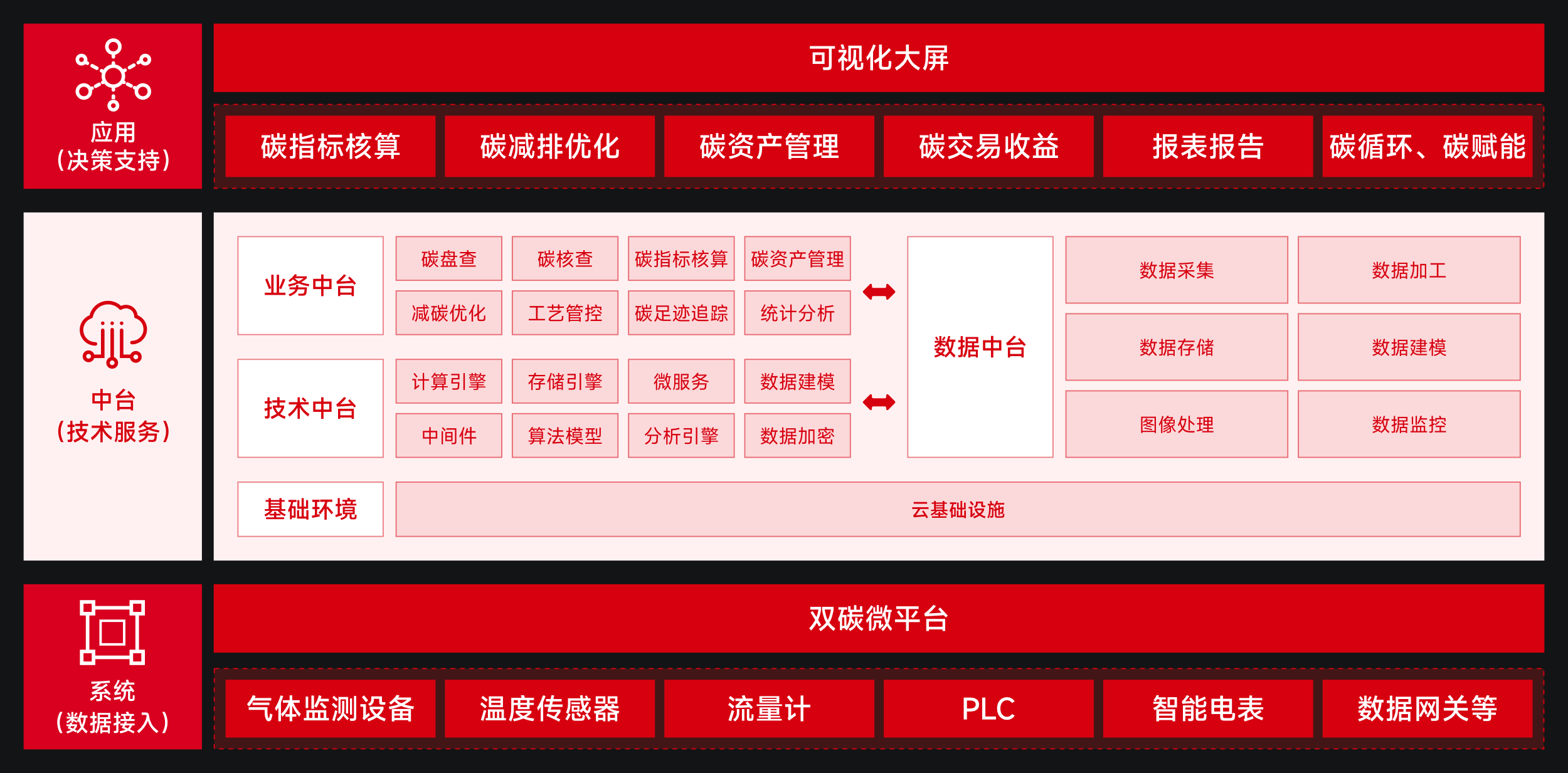 富陽區(qū)循環(huán)經(jīng)濟(jì)產(chǎn)業(yè)園餐廚垃圾處置項(xiàng)目實(shí)施的雙碳數(shù)據(jù)中心能夠有效地解決以上問題,并具備良好的實(shí)施成效。雙碳數(shù)據(jù)中心是基于E平臺(tái)(Eiiplat環(huán)境產(chǎn)業(yè)互聯(lián)網(wǎng)平臺(tái))和微平臺(tái),利用國家備案方法學(xué)打造,并通過雙碳微平臺(tái)落地應(yīng)用的軟硬件配套的智慧化系統(tǒng)。通過雙碳微平臺(tái)及相關(guān)傳感設(shè)備進(jìn)行數(shù)據(jù)采集,在中臺(tái)進(jìn)行數(shù)據(jù)傳輸、存儲(chǔ)與優(yōu)化,支撐上層功能實(shí)現(xiàn),為不同用戶提供服務(wù)。