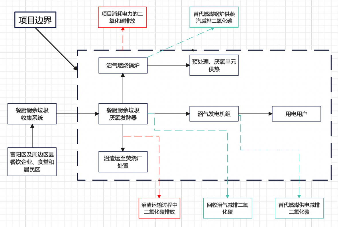 根據(jù)國家發(fā)改委備案的方法學(xué)CMS-001-V02用戶使用的熱能,可包括或不包括電能和CMS-016-V01通過厭氧分解進(jìn)行甲烷回收,項(xiàng)目碳核算的邊界為餐廚廚余垃圾從產(chǎn)生單位運(yùn)輸至處理廠后,進(jìn)行厭氧發(fā)酵,產(chǎn)生沼氣一部分進(jìn)入燃燒鍋爐產(chǎn)生蒸汽進(jìn)行供熱,另一部分進(jìn)入沼氣發(fā)電機(jī)發(fā)電上網(wǎng),產(chǎn)生的沼渣外運(yùn)至焚燒廠焚燒。