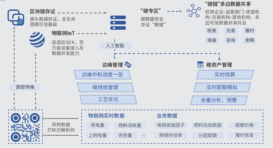 在區域碳達峰碳中和目標下,企業碳資產管理水平,快速實現低碳轉型顯得尤為重要。針對工業企業,實現基于區塊鏈為底層核心技術支撐,對碳排放及碳交易相關過程中的物聯網監測數據、文檔文件數據、業務系統數據進行上鏈,確保數據真實可信、不可篡改,基于區塊鏈智能合約聯通重點溫室氣體排放單位、自愿減排業主單位、政府部門、金融機構、交易機構等,將雙碳數據實時上鏈,以便管理機構進行監測和核算,為碳排放交易及相關業務過程中的數據交互提供保障,實現數據資產至碳資產的轉化,助力工業企業在持續健康生產加工的過程中也能順利實現雙碳目標的達成。