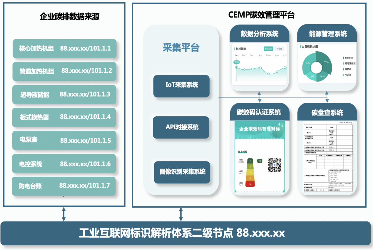 通過CEMP碳效管理平臺與電能供熱系統各環節數據采集設備對接,完成適配及平臺調試,實現標識解析二級節點部署及相關管理權限設定。