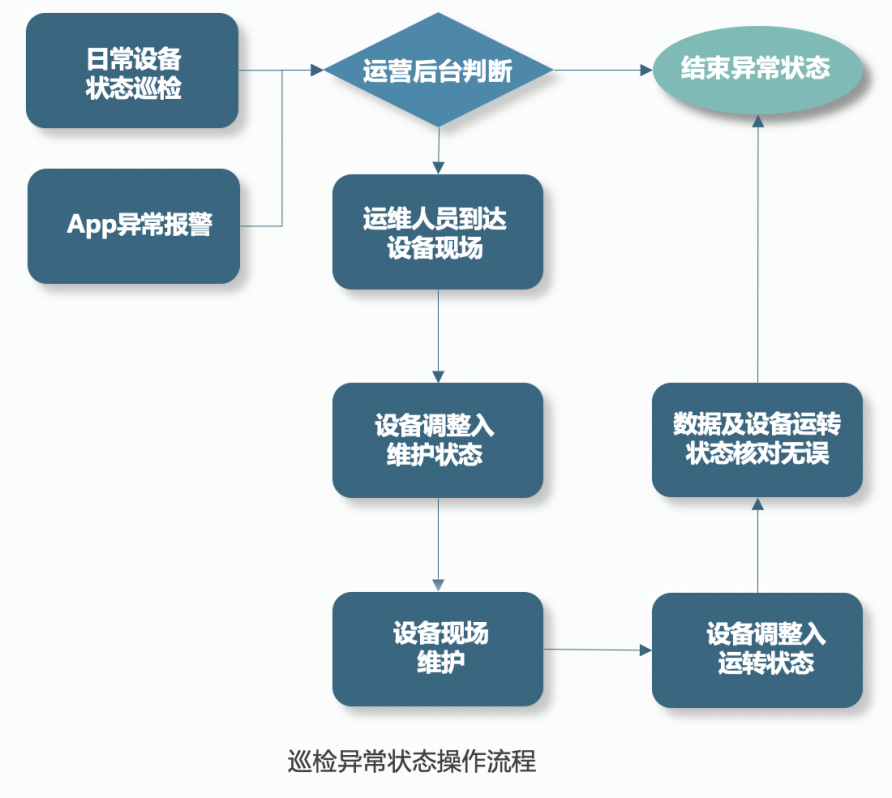 為了及時解決各類突發問題造成的設備告警,保證監測設備穩定運行,根據后臺信息實時查看設備狀況,實施單位進行定期或臨時的設備運維。依照設備檢定流程,實施單位定期對設備狀態進行巡檢,發現設備狀態異常后,按照如下流程處理: