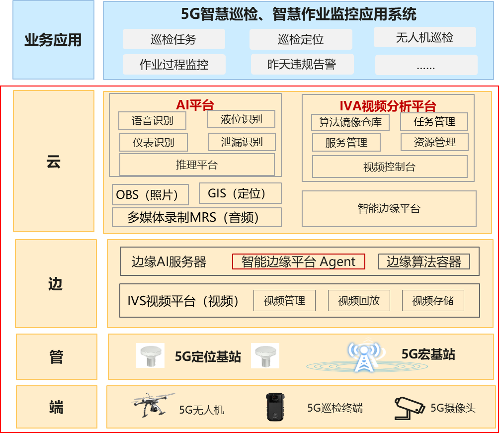 (1)利用利用5G大帶寬、低時延技術特性,實現移動視頻實時、快速上傳,并利用AI技術對視頻流數據進行智能分析。針對職工在作業現場的操作合規,安全防護合規,進行實時視頻采集,通過邊緣算法進行識別響應,對不合規,不安全,不謹慎的操作進行實時管理,告警同步;