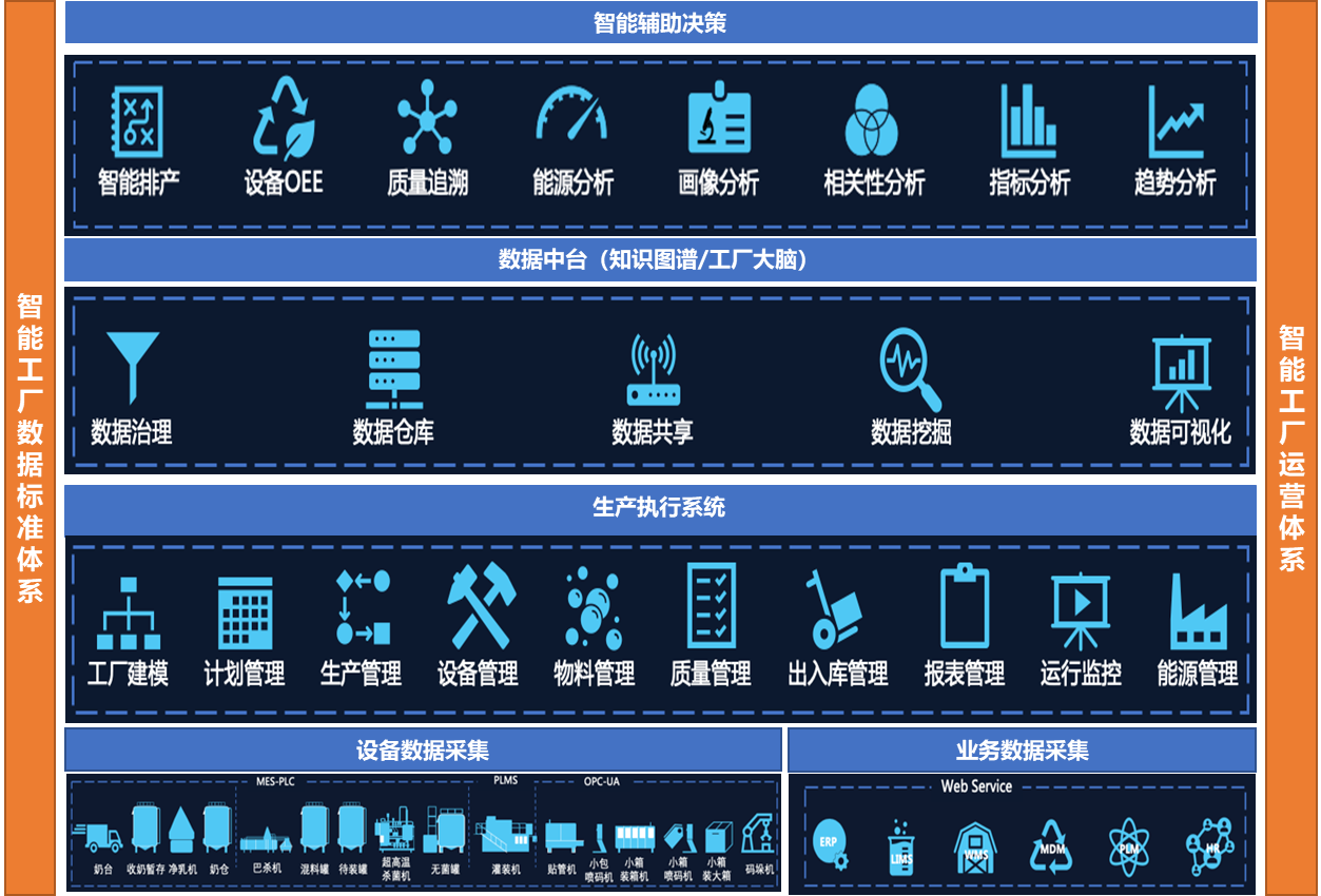 數字化工廠解決方案總體分為四個層面,一是建立智能工廠數據標準體系與運營體系;二是設備數采,優化設備數據采集,結合自動化設備改造,實現設備數采標準化、平臺化;三是打造數據平臺與行業大腦,充分融合設備數采數據,生產過程數據,外部信息系統數據,打破信息孤島,構建乳品行業知識圖譜;四是實現工廠智能輔助決策,利用大數據分析技術,支撐生產效率提升,設備綜合產能分析和工廠關鍵績效指標分析等。