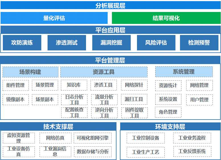 技術支撐層具備接入各類軟硬件資源、網絡仿真、可視化組網引擎等能力,為平臺提供基礎技術支撐;平臺管理層通過對鏡像、組件的接入,構建核心資源,提供對平臺本身的運營管理支撐,包括用戶管理、角色與權限管理等,同時提供應用層通用的資源庫,如各類安全工具、知識庫、數據采集工具等;平臺應用層是根據工業企業典型使用場景和業務流程,支撐攻防演練、滲透測試、漏洞挖掘、風險評估和檢測預警。