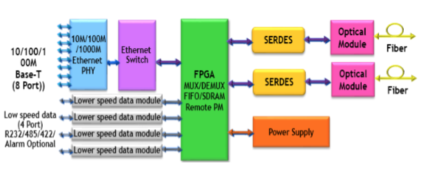 1)接入層設備根據端口數量不同分為多款。其信號處理原理相同,不同之處在于提供給用戶的以太網接口和低速數據接口的數量。低速數據接口可以靈活配置為RS-232、RS-485、通用輸入輸出接口GPIO、開關量或CAN-BUS接口。接入設備提供兩個上聯光口,速率1.25Gbit/s,可以和其它接入設備組成鏈形或環形網,通過光纖再與中間傳輸層設備的下聯端口連接,實現接入層設備與傳輸層設備的互通。接入層設備功能框圖如下圖所示。