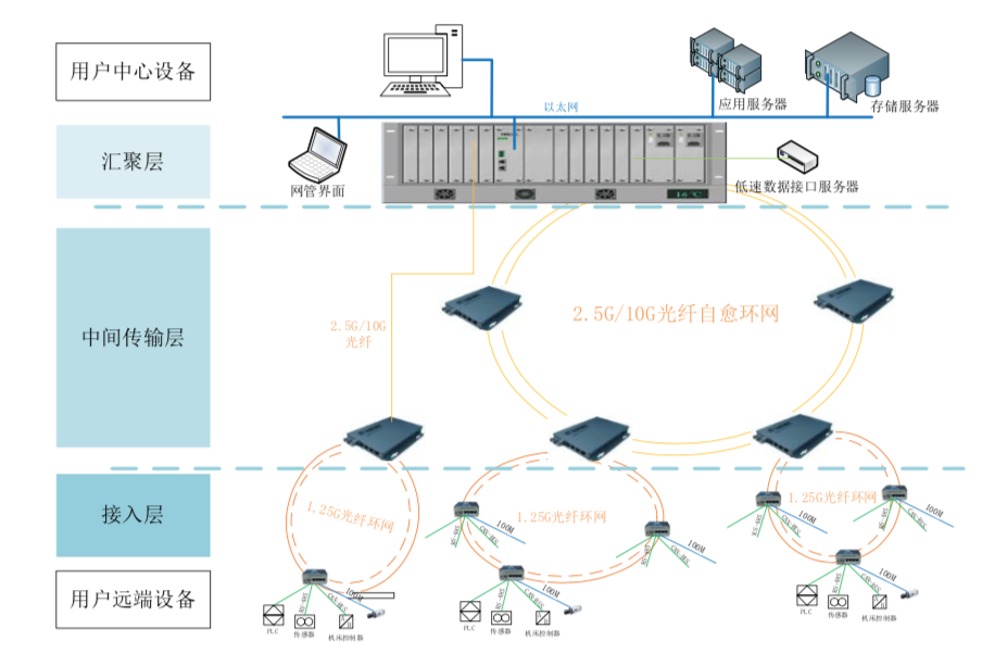 接入層設備:連接用戶的遠端設備,如傳感器、機床控制器、生產線機器人、網絡視頻攝像機等設備,把用戶的低速數據和以太網數據進行時分復用后,轉換為光信號,通過光纖傳送給上層設備。反向完成光信號到電信號的轉換,時隙信息解析,把低速數據和以太網數據分別送給相應用戶設備。