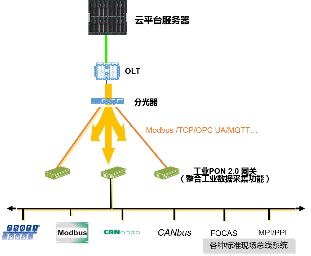 圖2-4 工業(yè)PON2.0的網(wǎng)絡(luò)拓?fù)浼軜?gòu)示意圖