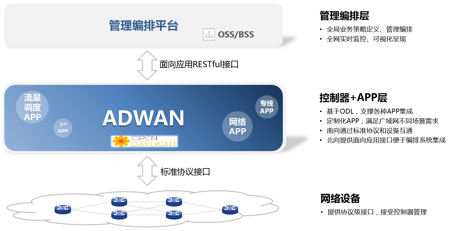 2)控制器+APP層:ADWAN分支解決方案的SDN控制器基于開源的ODL平臺,支撐各種APP集成;根據廣域網不同的場景,比如DCI網絡、骨干網、分支接入等,開發定制化、場景化的APP,滿足用戶在不同場景下的網絡需求;南向通過標準南向接口協議和設備互通;北向面向用戶提供定制化的API接口,實現和編排系統集成,滿足用戶差異化的業務需求;