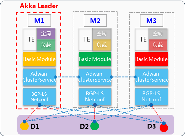 AD-WAN控制器集群由3臺控制器組成,互為備份,通過ODL Akka集群機制進行集群同步。集群控制器間工作模式為1主N備,同一時刻僅有一臺主控制器對外提供服務。當集群Leader故障后,由ODL akka重新選舉集群Leader,新選舉的主Leader負責集群業務管理,其余控制器作為備份。