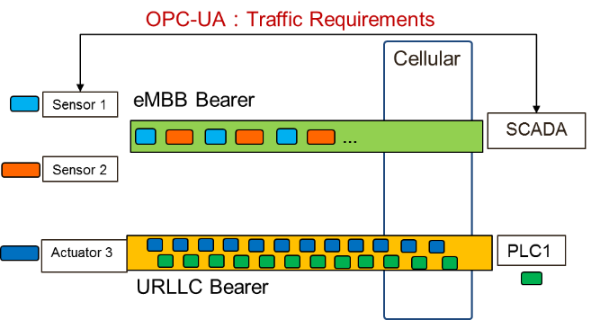 基于5G蜂窩和OPC-UA的結合,5G傳輸網絡實時的獲取待傳輸工業業務的傳輸需求,并提供對應的傳輸資源,更好的保障不同類別業務的傳輸性能。其中,圖7給出了工業業務傳輸需求獲取以及對應不同需求的蜂窩承載示意圖。