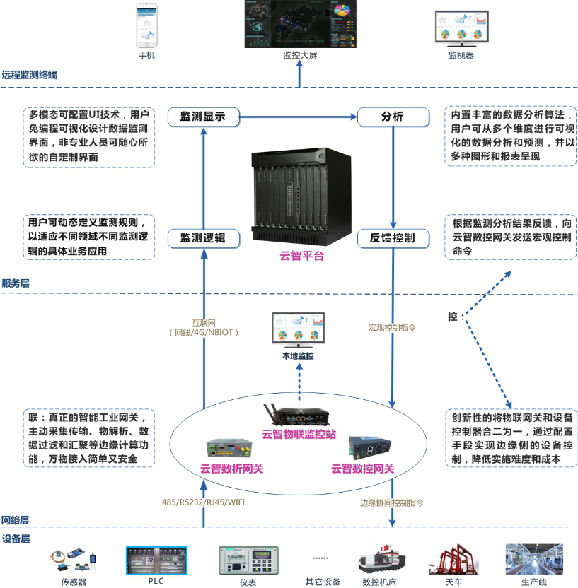 在“聯(lián)”方面,應(yīng)用邊緣計(jì)算理論,創(chuàng)新研發(fā)自主式物聯(lián)傳感技術(shù),開發(fā)出真正的新一代智能工業(yè)網(wǎng)關(guān),具備異構(gòu)多型工業(yè)設(shè)備任意接入,主流工業(yè)協(xié)議動(dòng)態(tài)適配,特別是在網(wǎng)關(guān)層對從多路傳感器、控制器采集到的異構(gòu)多態(tài)數(shù)據(jù)進(jìn)行解析、過濾和匯聚數(shù)等邊緣計(jì)算功能,將這種計(jì)算通用化和智能化,輔以配置化手段以適應(yīng)于任何設(shè)備,免除應(yīng)用層的設(shè)備解析處理程序編寫,使設(shè)備上網(wǎng)入云即插即用,輕松安全。在“感”方面,構(gòu)建了首個(gè)免編程智能生成應(yīng)用的物聯(lián)感知平臺,通過配置化、圖形化設(shè)計(jì)方式,快速實(shí)現(xiàn)設(shè)備在聯(lián)網(wǎng)監(jiān)測、狀態(tài)感知、聯(lián)動(dòng)報(bào)警、健康診斷及數(shù)據(jù)分析等功能的物聯(lián)網(wǎng)應(yīng)用系統(tǒng)。在“控”方面,創(chuàng)新性地將工業(yè)網(wǎng)關(guān)和設(shè)備控制器合二為一,內(nèi)置豐富控制算法,通過配置手段即可實(shí)現(xiàn)單設(shè)備的過程控制和多設(shè)備的協(xié)同控制,大幅降低物聯(lián)監(jiān)控網(wǎng)絡(luò)構(gòu)建難度和成本。