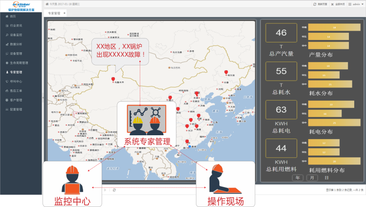 鍋爐綜合智能服務管理平臺應用對象包括鍋爐行業設備生產商、服務商等。通過此平臺,生產廠商可實現遠程監控所有已聯網設備的實時運行情況,同時通過大數據分析,也將在售后服務和設備升級等方面提供客觀的數據支持。系統集生產參數全程實時監控、生產實時返程控制、工藝流程監測、成本核算、市場分析以及科學探究等功能于一身的現代化工業智能化控制平臺。通過獲取設備實際生產、運行等管理方面的各項數據,基于云計算、大數據技術的海量工業數據的有效集成與分析,再由此建立起企業利潤與資源、能源消耗以及市場環境的關系,將獲取到的各種設備數據進行職能整合,建立起各個生產要素投入與產出以及利潤的關系。從而為生產者、管理者、決策者提供最優建議。以滿足鍋爐企業向“智慧工廠”轉型的迫切需求。