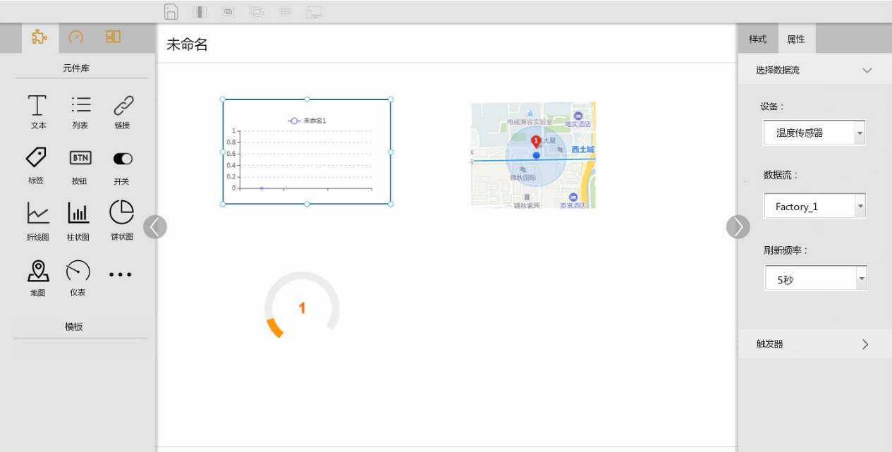 應(yīng)用管理子系統(tǒng):用戶可自行創(chuàng)建應(yīng)用,對(duì)應(yīng)用及其生命周期進(jìn)行操作和管理。例如可創(chuàng)建一個(gè)環(huán)境監(jiān)測(cè)應(yīng)用,管理其中的監(jiān)測(cè)設(shè)備、監(jiān)測(cè)數(shù)據(jù),對(duì)應(yīng)的監(jiān)測(cè)視圖、設(shè)置的報(bào)警觸發(fā)器、告警規(guī)則及告警處理等。用戶可通過(guò)可視化應(yīng)用編輯界面來(lái)快速創(chuàng)建應(yīng)用,如下圖。通過(guò)拖拽左側(cè)應(yīng)用元件庫(kù)的元件,在右側(cè)選擇相應(yīng)的設(shè)備、數(shù)據(jù)流等進(jìn)行綁定,即可完成應(yīng)用的創(chuàng)建,簡(jiǎn)單快捷。