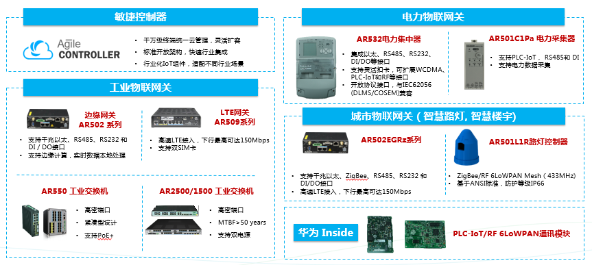 EC-IoT解決方案包括終端通信模塊(PLC-IoT/RF 6LowPan),邊緣計(jì)算網(wǎng)關(guān)(AR502系列產(chǎn)品),邊緣計(jì)算核心板(HiGrid T1和EC Core-L-1)和敏捷控制器(Agile Controller),其中終端通信模塊支撐終端層設(shè)備間的智能互聯(lián),邊緣計(jì)算網(wǎng)關(guān)負(fù)責(zé)對(duì)這些設(shè)備進(jìn)行智能管理,而敏捷控制器通過開放的API與合作伙伴們的行業(yè)應(yīng)用系統(tǒng)進(jìn)行對(duì)接,EC-IoT解決方案主要應(yīng)對(duì)兩類業(yè)務(wù)場(chǎng)景: