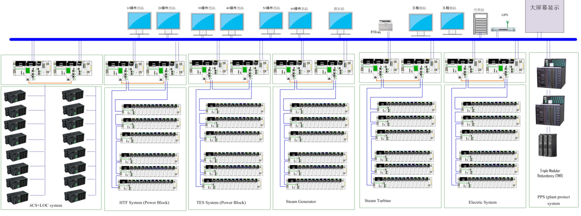 ? 發(fā)電島及儲換熱系統(tǒng):7,800 IO, PES (4套 M580 HSBY) + 492 IO, Triconex