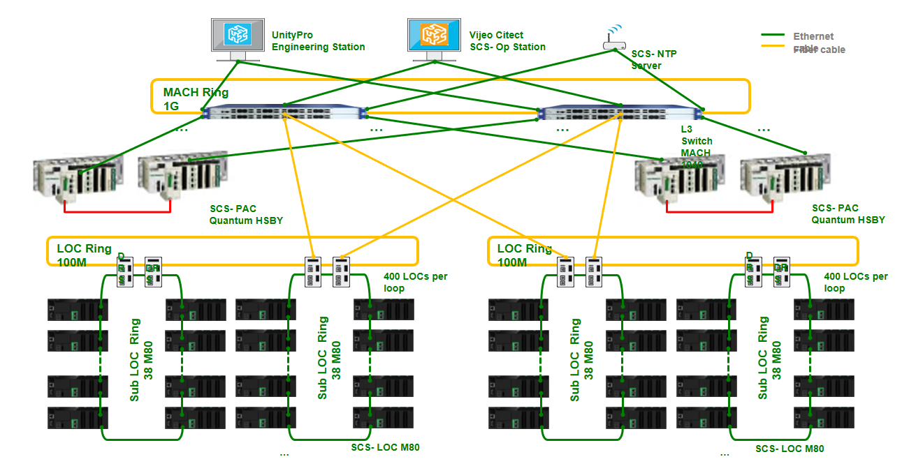 在鏡場每個LOC的控制網(wǎng)絡采用超五類線,在鏡場區(qū)域控制節(jié)點采用多模/單模光纖與上層Level2級網(wǎng)絡鏈接。在Level2與Level3層級及以上層級均采用光纖鏈接的方式。如此方式的系統(tǒng)構架比傳統(tǒng)的網(wǎng)絡構架可以節(jié)省大約1/4的網(wǎng)絡布線,及其相應的輔材附件以及大量的人工時。
