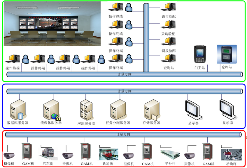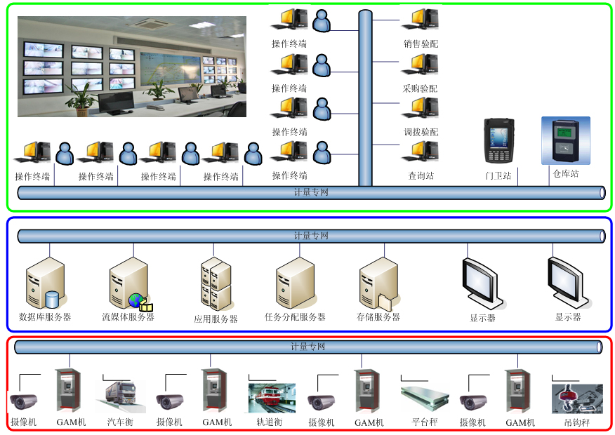 整個系統采用集中管理、分布監控的設計模式,所有的業務數據(數據、語音、圖像、控制信號等)通過無人值守機(終端)和軟件系統進行就地處理,通過計量專用光纖網絡與控制中心進行交互。