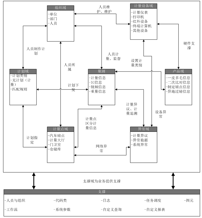 根據計量業務應用的數據特性,考慮到各主題域之間的關聯度,將計量業務數據劃分為計劃域、組織域、計量設備域、量測域、產品域、計量點域和異常域等七大域,同時將對上述域形成支撐的公共部分組成支撐域。