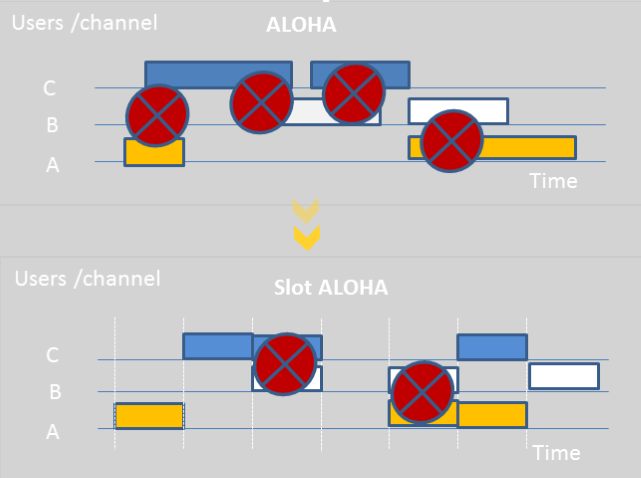 當終端有上行數據要發時,隨機獲取上行發送機會;各終端之間的競爭機制是Slot-ALOHA,比完全隨機的ALOHA系統頻譜效率提升一倍,最終轉化為系統容量的增加。